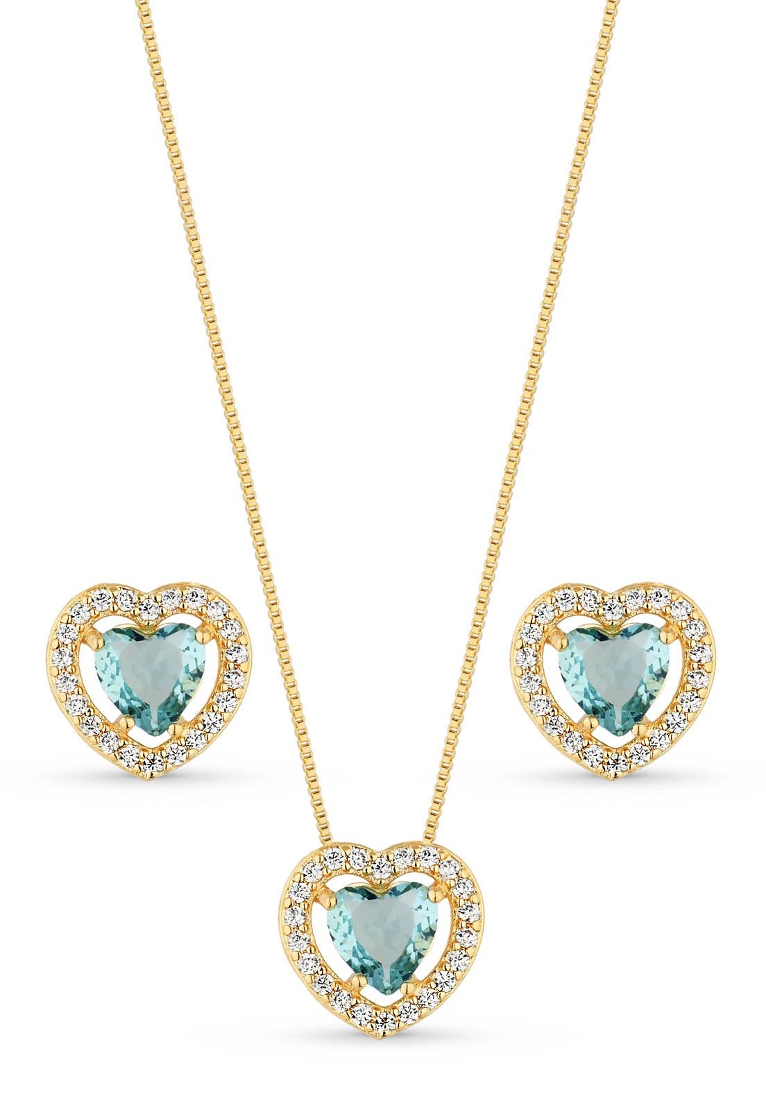 Conjunto Semijoia Colar E Brinco Coração Azul E Micro Zircônias Banhado A Ouro 18k
