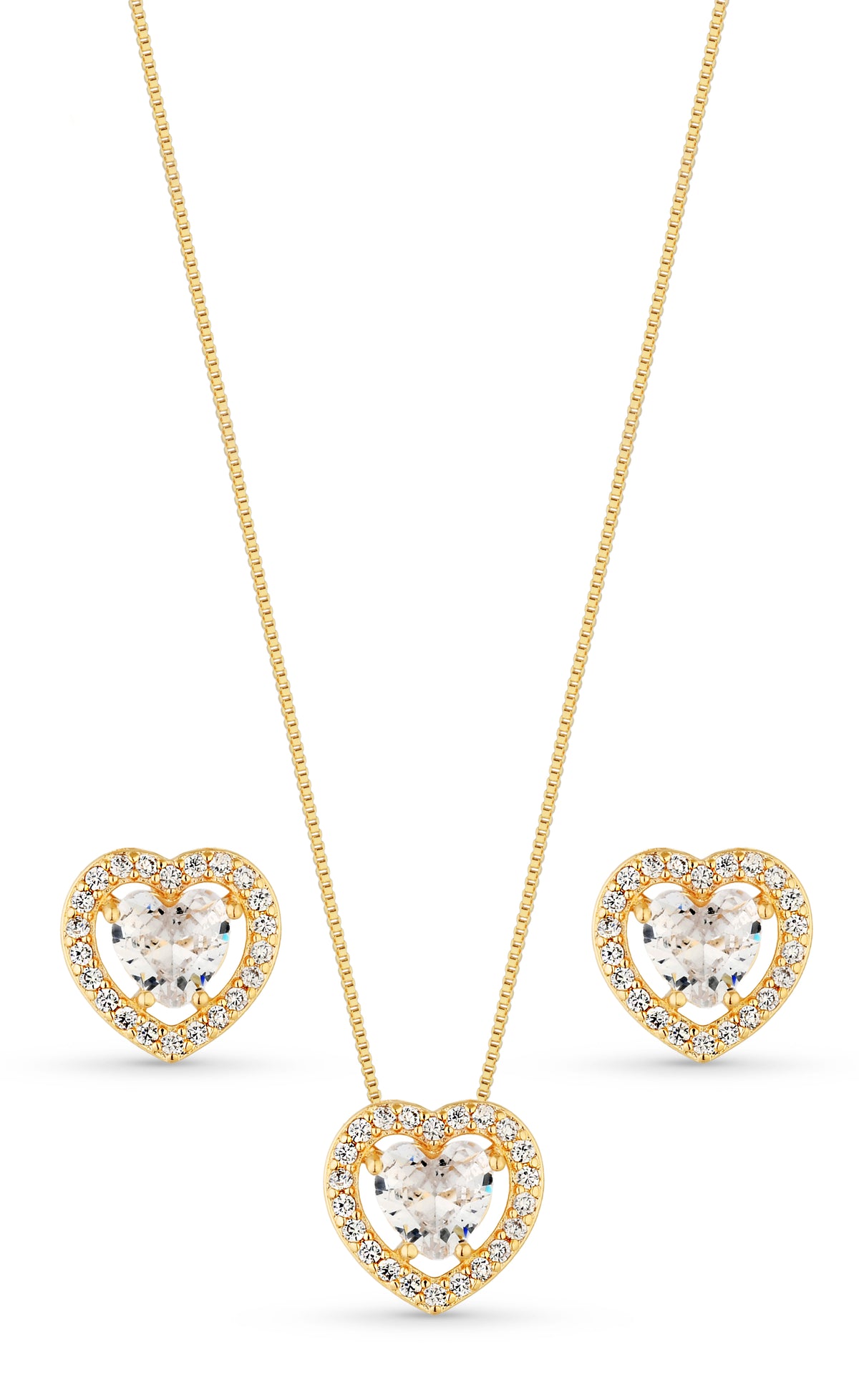 Conjunto Semijoia Colar E Brinco Coração Cristal E Micro Zircônias Banhado A Ouro 18K