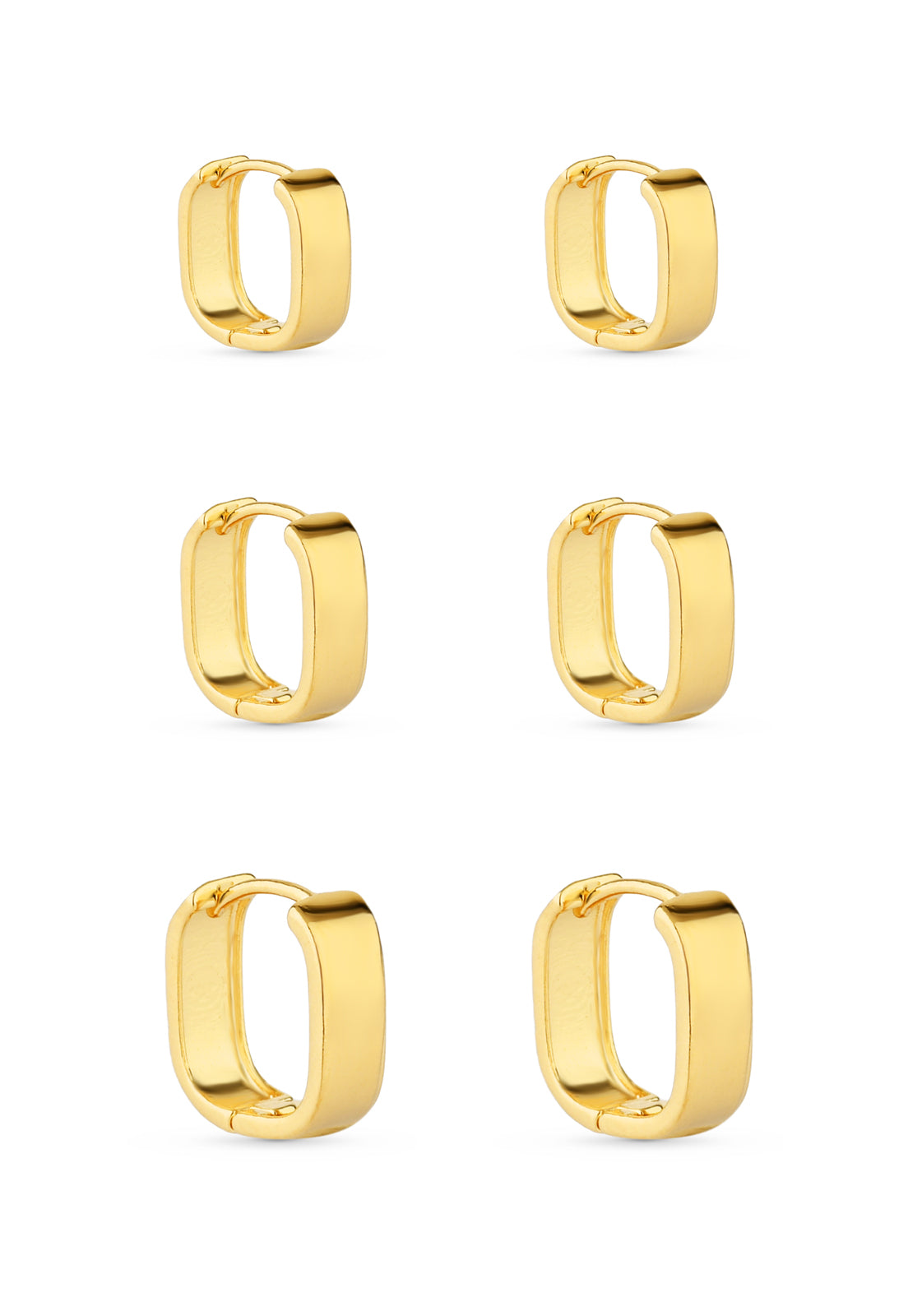 O trio de brincos semijoia de argolas quadradas lisas é a escolha perfeita para quem busca modernidade em um único acessório.
